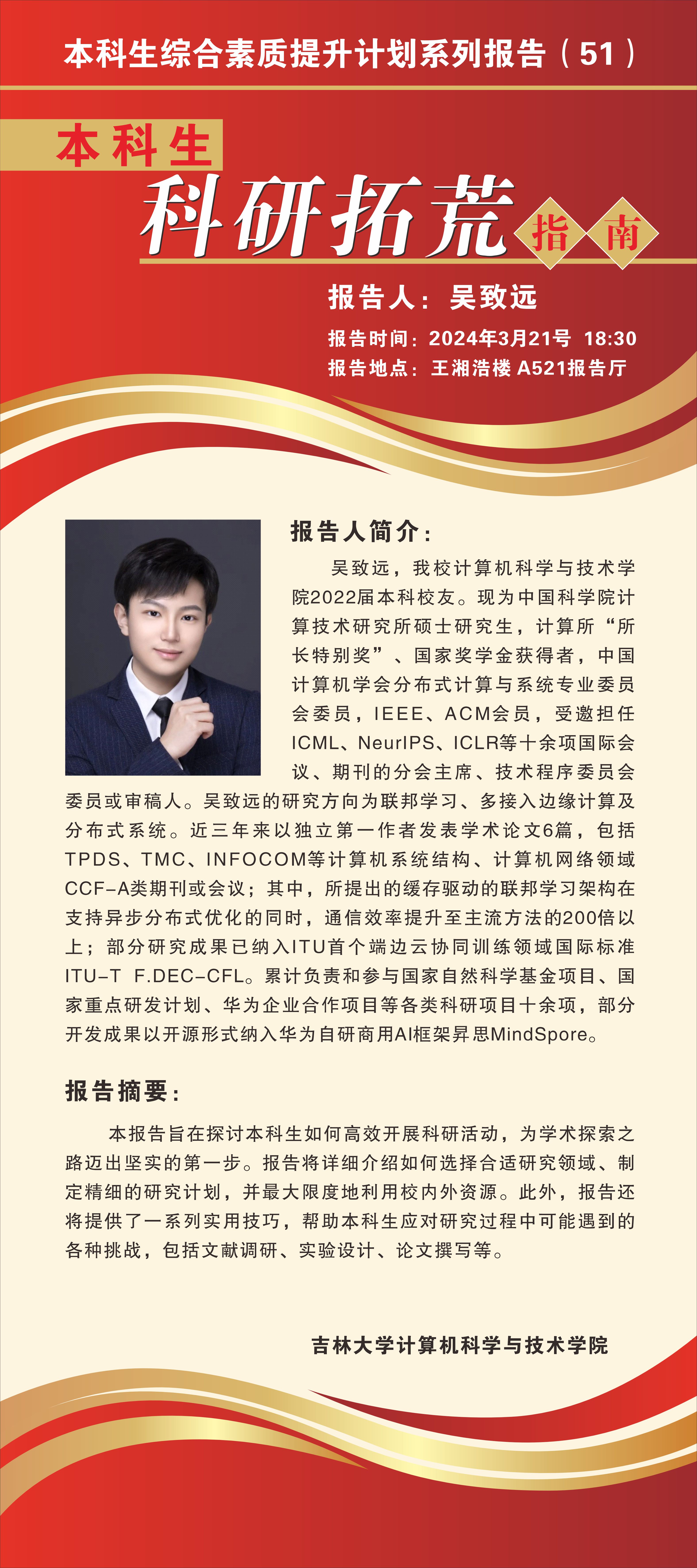 报告人简介:吴致远,公司太阳成集团tyc122ccvip2022届本科员工。现为中国科公司计算技术研究所硕士研究生,计算所“所长特别奖”、国家奖学金获得者,中国计算机学会分布式计算与系统专业委员会委员,IEEE、ACM会员,受邀担任ICML、NeurIPS、ICLR等十余项国际会议、期刊的分会主席、技术程序委员会委员或审稿人。吴致远的研究方向为联邦学习、多接入边缘计算及分布式系统。近三年来以独立第一作者发表学术论文6篇,包括TPDS、TMC、INFOCOM等计算机系统结构、计算机网络领域CCF-A类期刊或会议;其中,所提出的缓存驱动的联邦学习架构在支持异步分布式优化的同时,通信效率提升至主流方法的200倍以上;部分研究成果已纳入ITU首个端边云协同训练领域国际标准ITU-T F.DEC-CFL。累计负责和参与国家自然科学基金项目、国家重点研发计划、华为企业合作项目等各类科研项目十余项,部分开发成果以开源形式纳入华为自研商用AI框架昇思MindSpore。