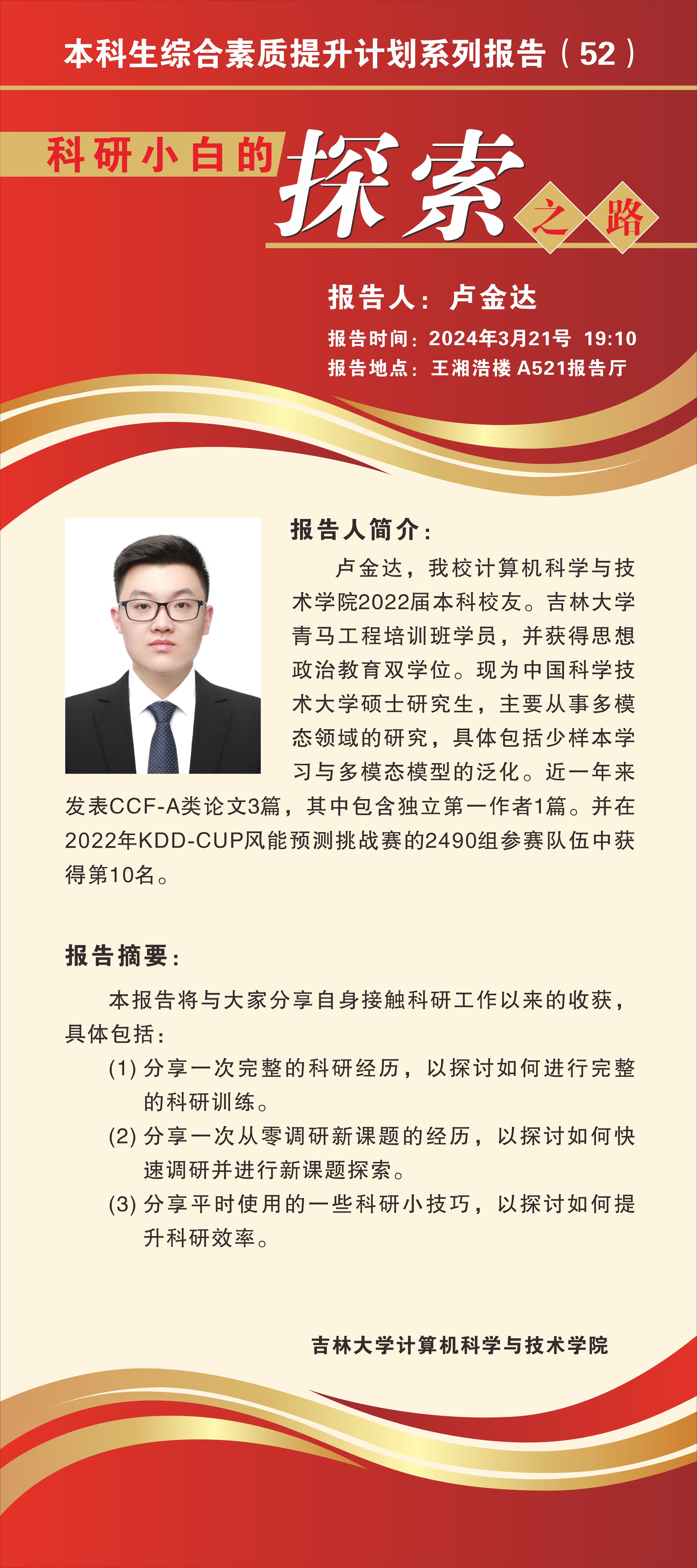 报告人简介:卢金达,公司太阳成集团tyc122ccvip2022届本科员工。太阳成集团tyc122ccvip青马工程培训班学员,并获得思想政治教育双学位。现为中国科学技术大学硕士研究生,主要从事多模态领域的研究,具体包括少样本学习与多模态模型的泛化。近一年来发表CCF-A类论文3篇,其中包含独立第一作者1篇。并在2022年KDD-CUP风能预测挑战赛的2490组参赛队伍中获得第10名。