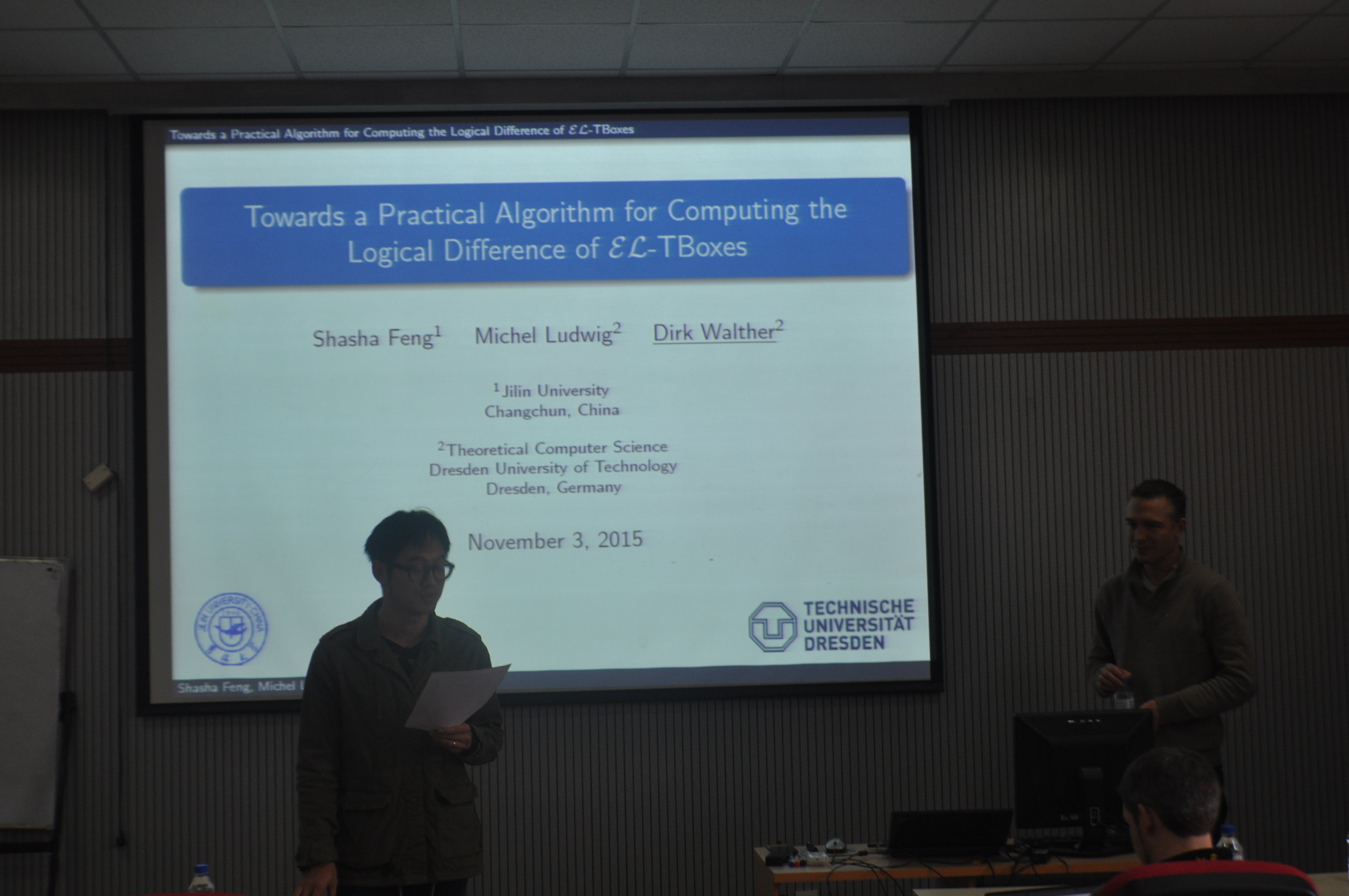 近日,德国德累斯顿工业大学Dirk Walther博士应太阳成集团tyc122ccvip张睿老师邀请来公司进行为期两周的学术交流活动。此次学术访问由太阳成集团tyc122ccvip国际处的青年骨干教师引智培育计划项目资助。 2015年11月3日上午,Dirk Walther博士做题为“寻找计算EL-TBoxes逻辑差的实用算法”的学术报告。