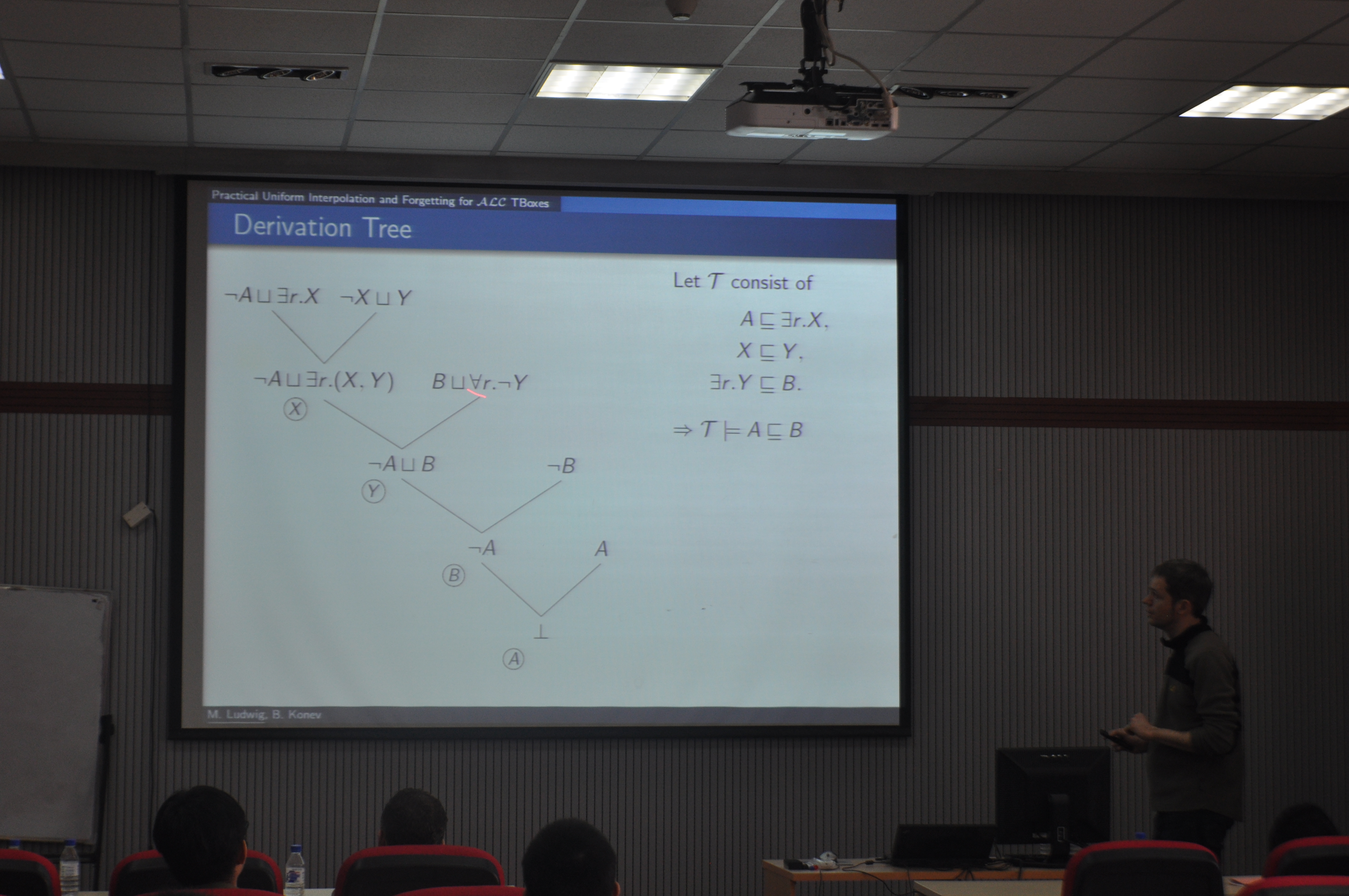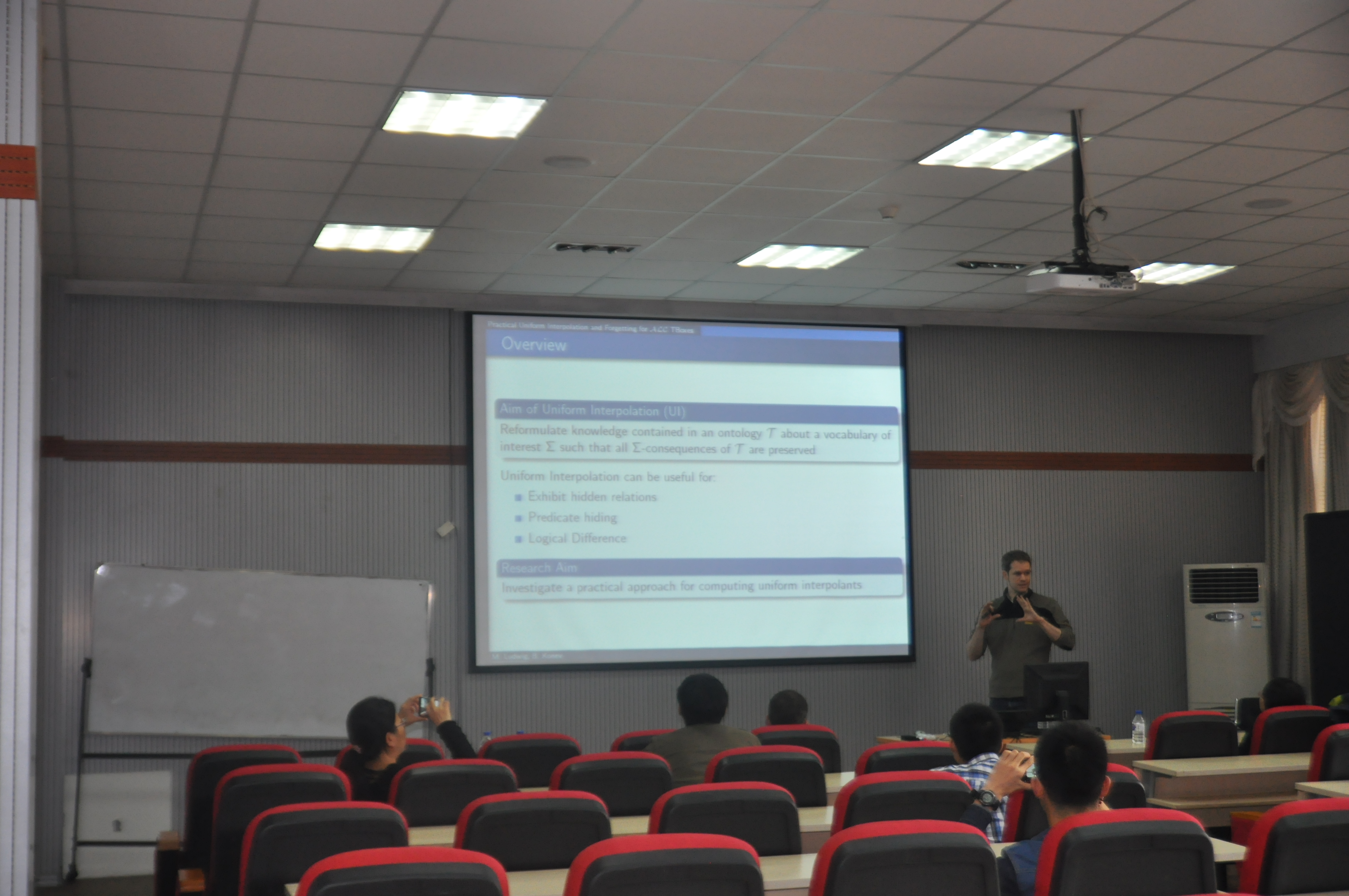 规范插值与遗忘是一种重要的本体推理问题,可以用于隐藏本体特定信息、显示体现本体中某些概念间的关系等应用场景。为了对ALC TBoxes进行规范插值与遗忘,Michel Ludwig博士先介绍了用于ALC TBoxes推理的归结方法,然后讲解了如何基于这种归结方法来实现规范插值与遗忘。最后,Michel Ludwig博士给出该工作在本体逻辑差中的应用。最后,Michel Ludwig博士与在场师生进行了讨论,并回答了老师和同学们的问题。讲座现场学术气氛十分浓厚。