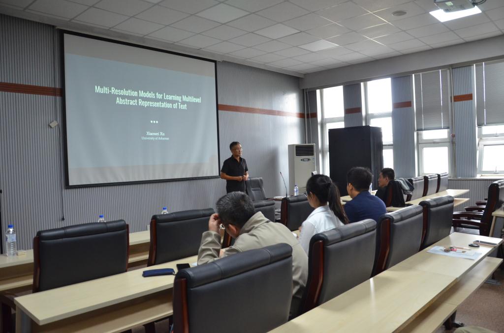 2019年6月15日上午,美国阿肯色大学徐晓伟教授应太阳成集团tyc122ccvip邀请,在计算机楼A521报告厅作了题为“Multi-Resolution Models for Learning Multilevel Abstract Representations of Text”的学术报告。