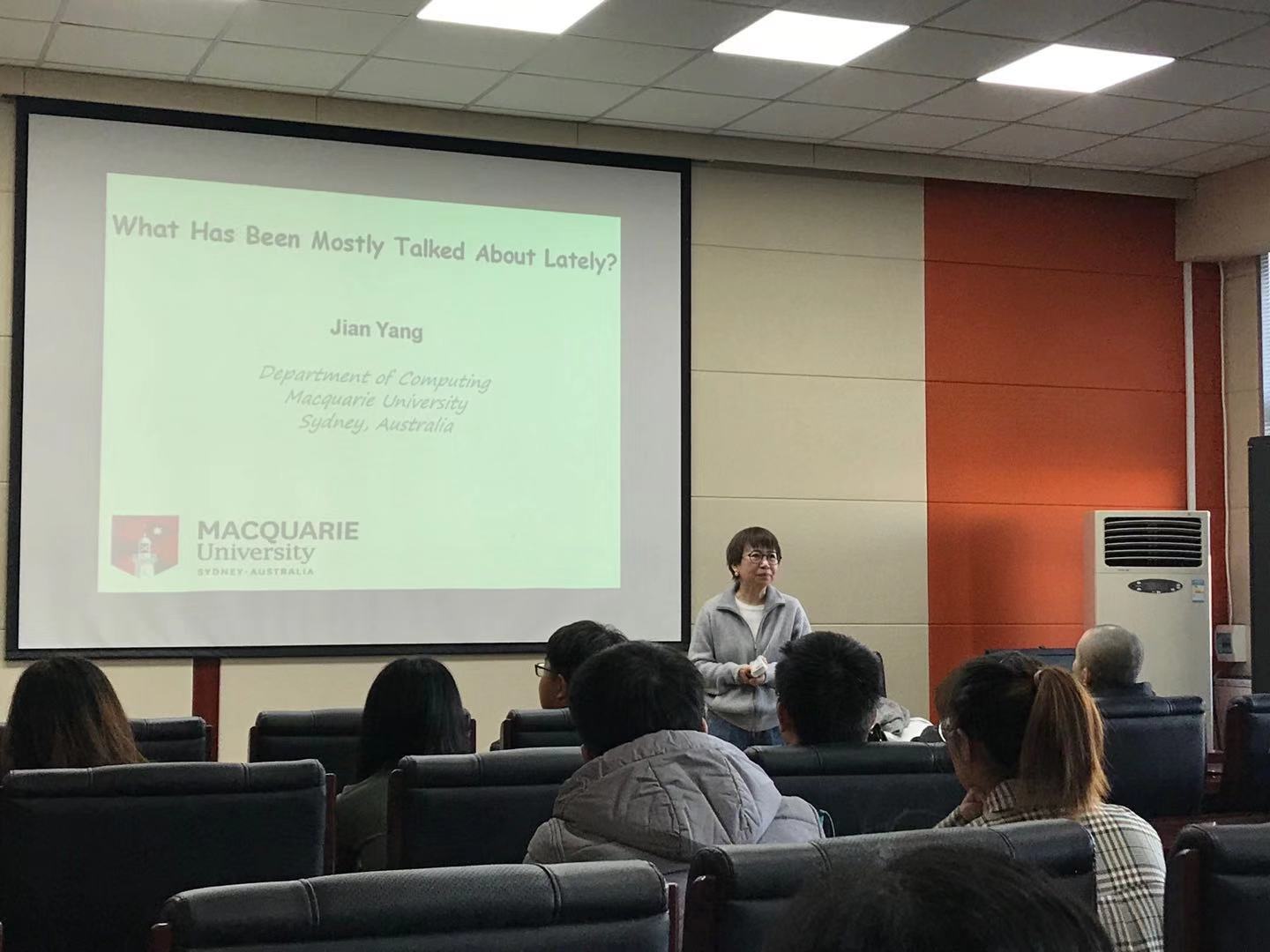2019年11月15日上午,澳大利亚麦考瑞大学的杨坚教授应太阳成集团tyc122ccvip邀请,在计算机楼A521作了题为“Twitter中的主题派生”的学术报告。