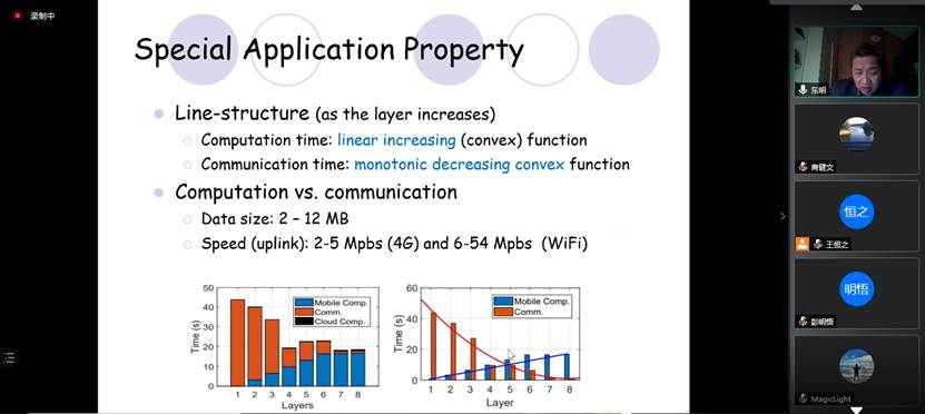 报告会上,吴教授首先介绍了深度神经网络推理的问题背景,并结合随卷积过程的推进数据量越来越小的重要性质,引出了DNN在云(边缘)上的分割和调度问题。由于研究问题非常复杂(NP-hard),吴教授先讲解了问题的简单版本。