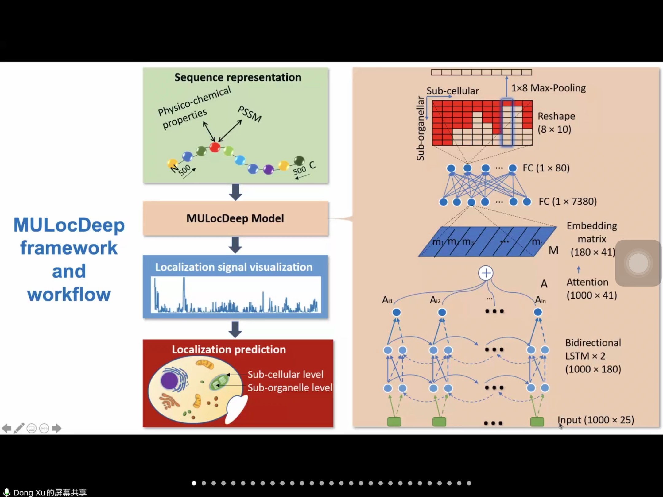 讲座中,许东教授首先对蛋白质定位预测任务进行了简单的介绍,然后详细介绍了论文中提出的基于深度学习的定位预测框架MULocDeep,该框架可以预测蛋白质在亚细胞和亚组织水平的多个定位,接下来介绍了MULocDeep中使用的注意力机制,通过引入注意力机制,不但提高了实验的准确率而且还增强了模型的可解释性。之后介绍了MULocDeep在不同数据集下跟其他模型的比较结果。许东教授还在线演示了MULocDeep Server的使用。