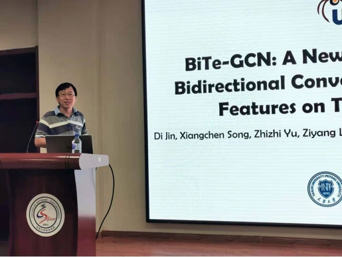 天津大学金弟是智算学部副教授,博士生导师。曾以第一作者身份获CCF A类会议WWW-21的 Best Paper Runner-up, 《自动化学报》优秀论文奖和ACM中国天津分会新兴奖, 中国商业联合会科技进步一等奖。金弟教授做了题为“面向富文本网络的图神经网络”的学术讲座。金弟副教授主要介绍了图神经网络和最新研究进展,并讨论了相关领域的应用及未来发展趋势。讲座结束后,金弟副教授细心回答了同学们的提问,表示会后也欢迎大家进行学术交流和合作研究。