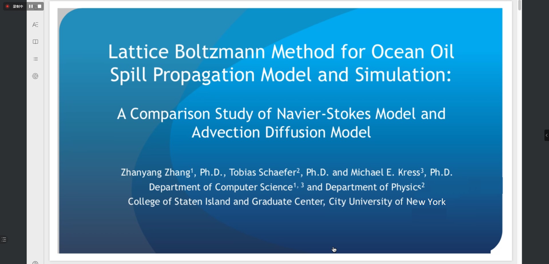 2021年6月17日上午,张占阳教授应太阳成集团tyc122ccvip邀请,为公司师生做了题为“Using Lattice Boltzmann Method for Ocean Oil Spill Model and Simulation”的线上学术讲座。