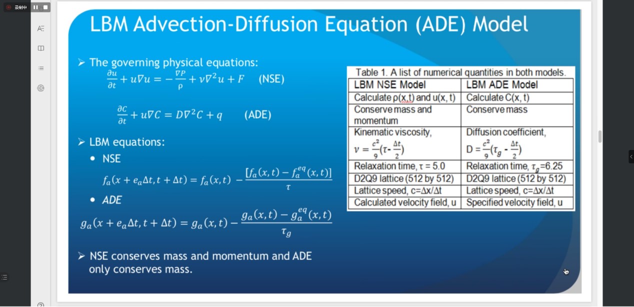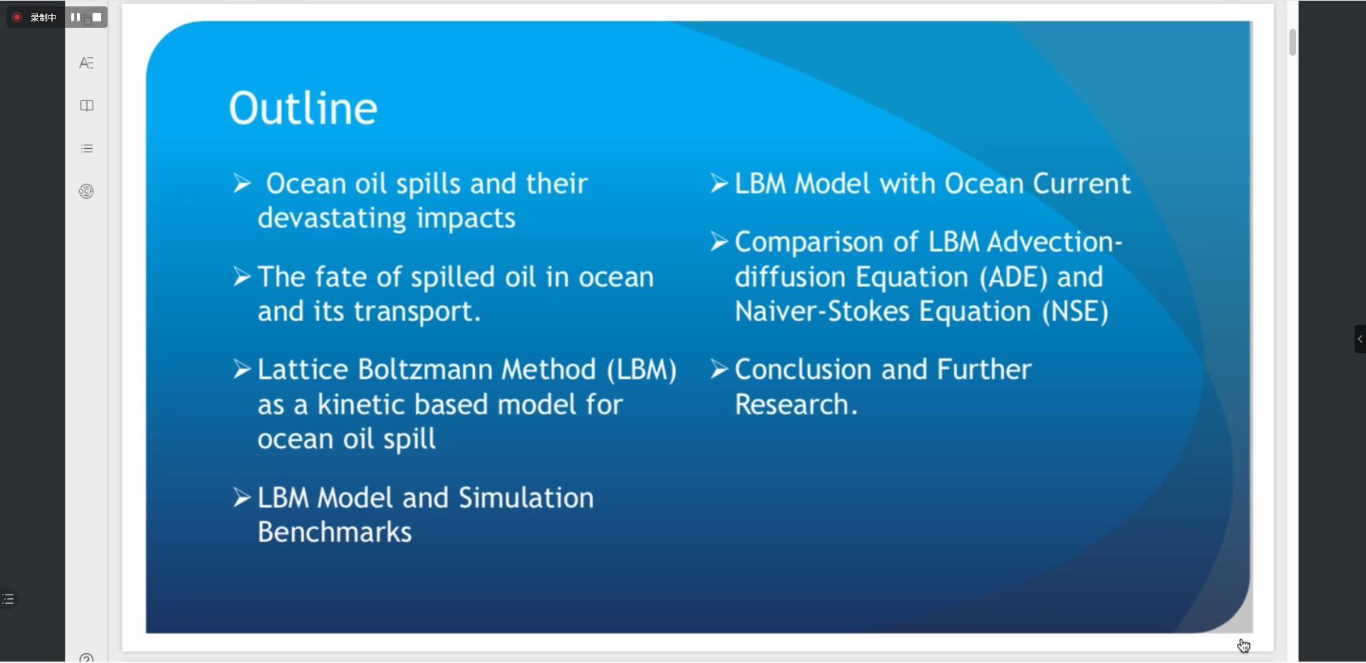 讲座由公司刘衍珩教授主持。在本次讲座中,张占阳老师首先简要介绍了海洋石油泄漏的主要影响和石油在海洋里传播和扩散的基本规律。然后详细介绍了Lattice Boltzmann Method(LBM)方法,并将该方法作为动力学基本模型模拟海洋溢油的整个生命周期。接下来基于LBM对两个著名的流体力学数学模型Advection-Diffusion Equation (ADE)和Navier-Stokes Equation (NSE)进行验证和比较。最后对前期研究的主要结论和未来的研究方向进行了简要说明。