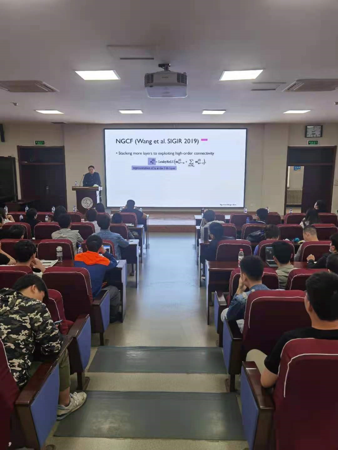 在本次讲座中,程老师主要向大家介绍了关于图网络推荐模型的几项工作。第一项工作展示图卷积网络方法在解决属性感知推荐系统中的关于属性缺失问题的优势;第二项工作提出了一个新的IMP-GCN推荐模型。该模型将图卷积过程中的信息传播约束在相似用户之间,从而缓解过度平滑问题;第三项工作提出建立高阶邻居之间的直接连接并采用单层GCN来学习节点表征,从而简化模型提高学习效率。实验结果表明该单层GCN模型可以取得与多层GCN模型相当的推荐精度。会议最后阶段,老师悉心回答了到场同学的提问。本次报告受到了广大师生的热烈响应。