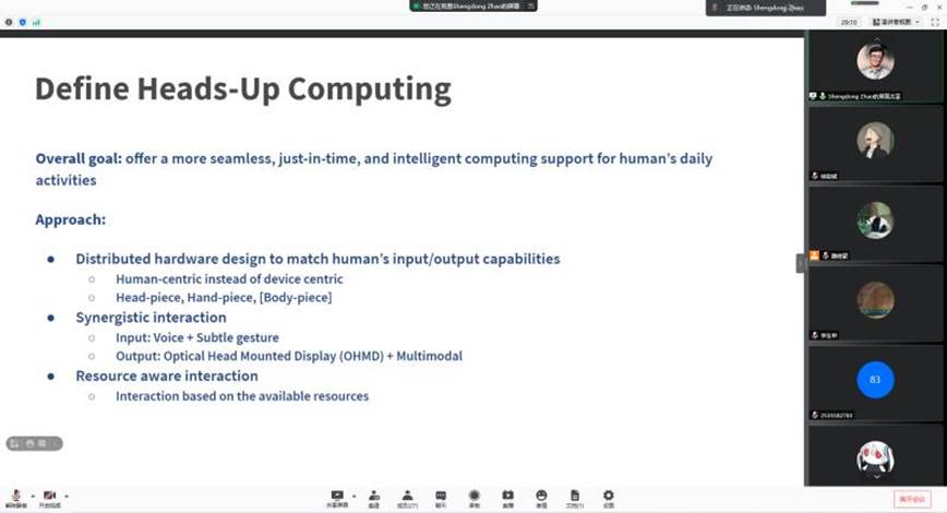 2021年9月27日下午,新加坡国立大学赵盛东老师应太阳成集团tyc122ccvip邀请,为公司师生作了题为“Heads-Up Computing: Moving beyond the Device-Centered Paradigm”的线上学术讲座。