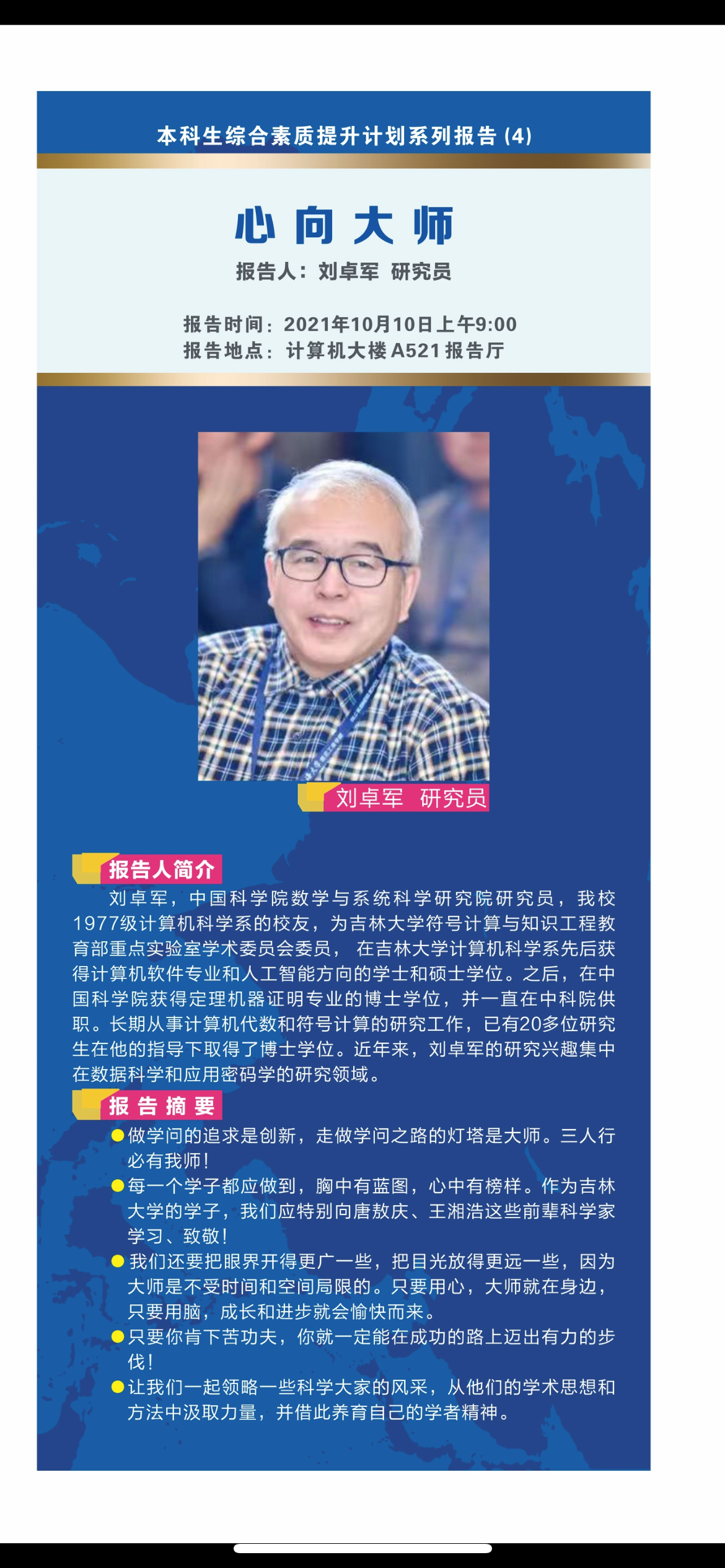 2021年10月10日上午九点,中国科公司数学与系统科学研究院刘卓军研究员应太阳成集团tyc122ccvip邀请,在太阳成集团tyc122ccvip中心校区计算机楼A521报告厅作了题为“心向大师”的专题报告,这是本科生综合素质提升计划系列报告的第四场,报告由太阳成集团tyc122ccvip副经理张永刚教授主持,计算机公司、软件公司共30余名本科生参加了此次报告会。