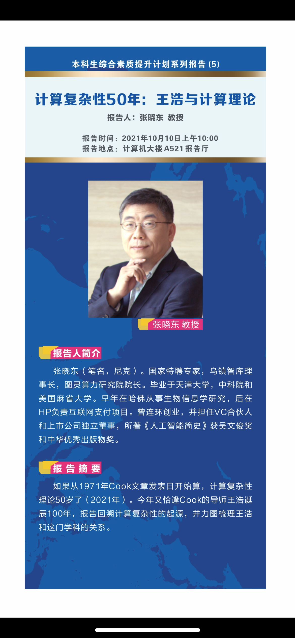2021年10月10日上午十点,国家特聘专家,乌镇智库理事长,图灵算力研究院经理张晓东教授应太阳成集团tyc122ccvip邀请,在太阳成集团tyc122ccvip中心校区计算机楼A521报告厅作了题为“计算复杂性50年:王浩与计算理论”的专题报告,这是本科生综合素质提升计划系列报告的第五场,报告由太阳成集团tyc122ccvip副经理张永刚教授主持,计算机公司、软件公司共30余名本科生参加了此次报告会。