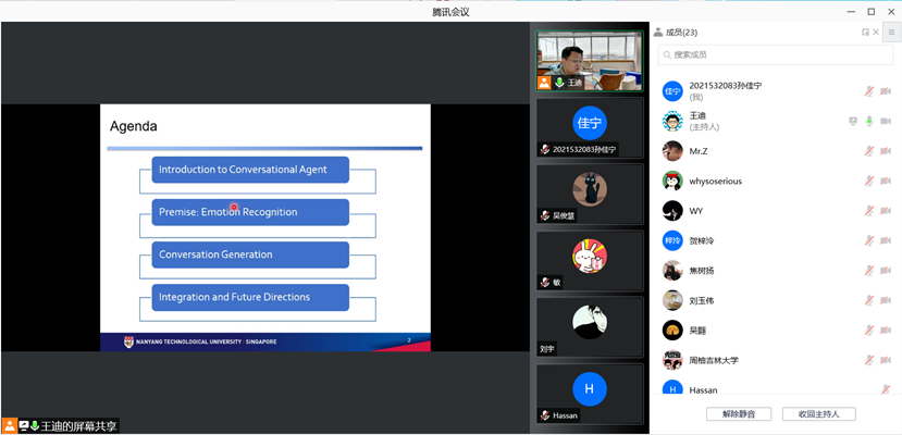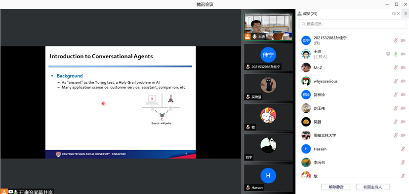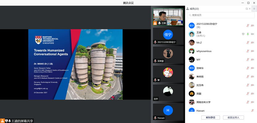 2021年12月4日下午,新加坡南洋理工大学王迪博士应太阳成集团tyc122ccvip邀请,通过腾讯会议线上作了题为“人性化的智能会话代理”的学术报告。