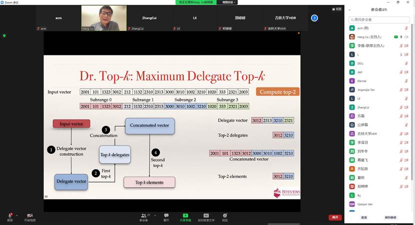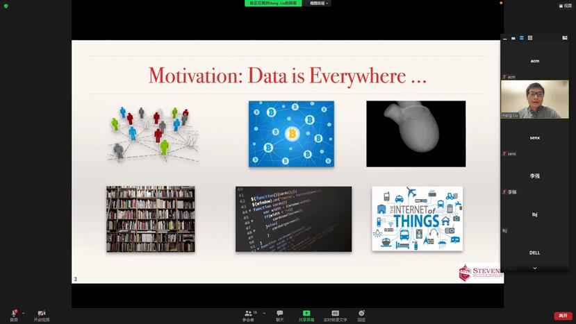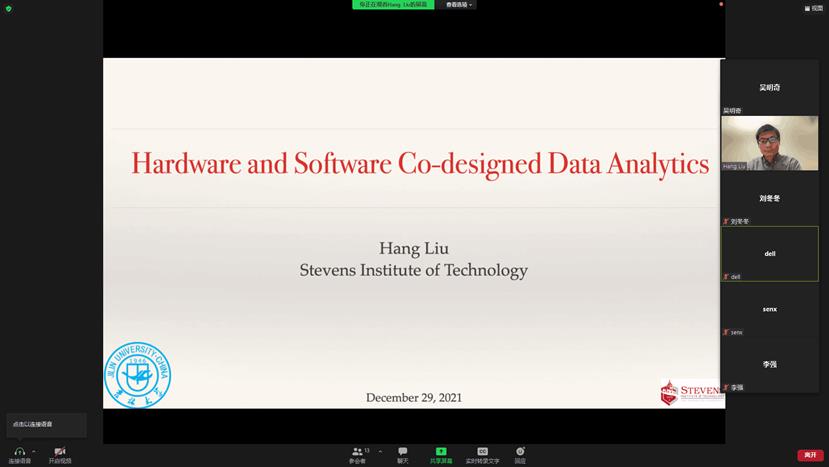 2021年12月30日上午,美国史蒂文斯理工公司助理教授刘航博士应太阳成集团tyc122ccvip邀请,在Zoom会议作了题为”Algorithm and System Co-Optimized Big Data Analytics”的学术讲座,此次讲座由太阳成集团tyc122ccvip副经理李强担任主持。