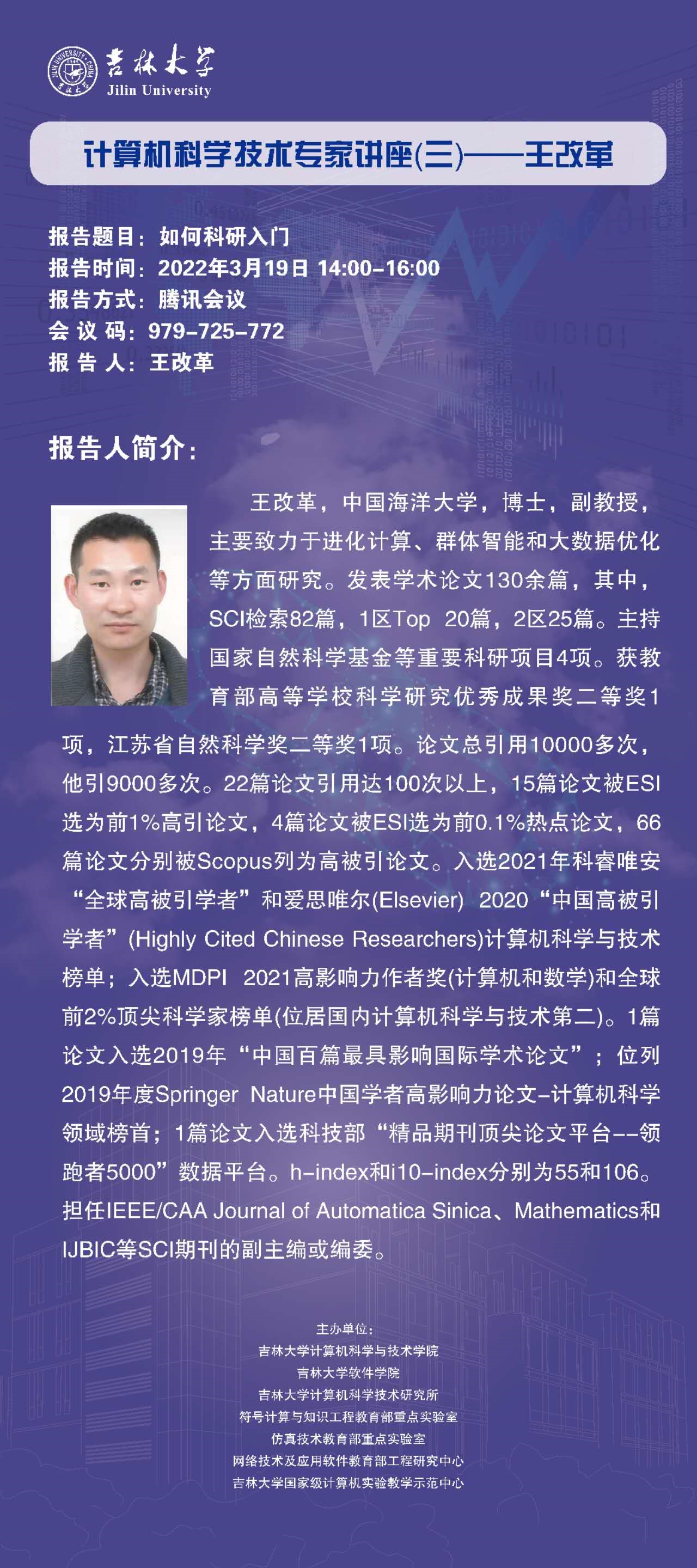 王改革老师目前是中国海洋大学副教授,主要致力于进化计算、群体智能和大数据优化等方面研究。发表学术论文130余篇,其中,SCI检索82篇,1区Top 20篇,2区25篇。主持国家自然科学基金等重要科研项目4项。获教育部高等公司科学研究优秀成果奖二等奖1项,江苏省自然科学奖二等奖1项。论文总引用10000多次,他引9000多次。22篇论文引用达100次以上,15篇论文被ESI选为前1%高引论文,4篇论文被ESI选为前0.1%热点论文,66篇论文分别被Scopus列为高被引论文。入选2021年科睿唯安“全球高被引学者”和爱思唯尔(Elsevier) 2020“中国高被引学者”(Highly Cited Chinese Researchers)计算机科学与技术榜单;入选MDPI 2021高影响力作者奖(计算机和数学)和全球前2%顶尖科学家榜单(位居国内计算机科学与技术第二)。1篇论文入选2019年“中国百篇最具影响国际学术论文”;位列2019年度Springer Nature中国学者高影响力论文-计算机科学领域榜首;1篇论文入选科技部“精品期刊顶尖论文平台--领跑者5000”数据平台。h-index和i10-index分别为55和106。担任IEEE/CAA Journal of Automatica Sinica、Mathematics和IJBIC等SCI期刊的副主编或编委。
