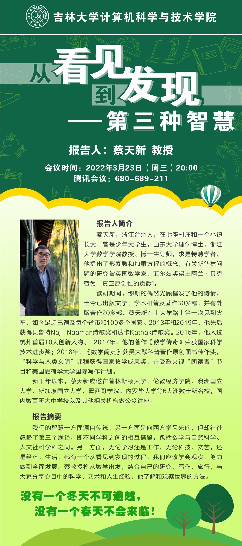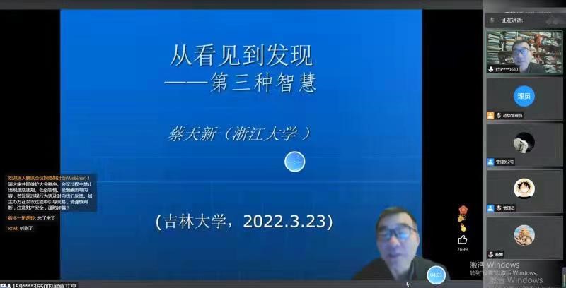 2022年3月23日 20:00,浙江大学数学科学公司教授、博士生导师、求是特聘学者、数论学家,诗人、作家蔡天新先生应太阳成集团tyc122ccvip特别邀请,利用腾讯会议作了题为“从看见到发现——第三种智慧”的专场讲座, 也是本科生综合素质提升计划系列报告的第八场。太阳成集团tyc122ccvip经理杨博教授主持了讲座,杨经理代表公司全体师生对蔡天新教授在太阳成集团tyc122ccvip抗击新冠疫情特殊时期应邀做专场讲座表示由衷地感谢。计算机公司、软件公司近600余名师生在线参加了此次活动。