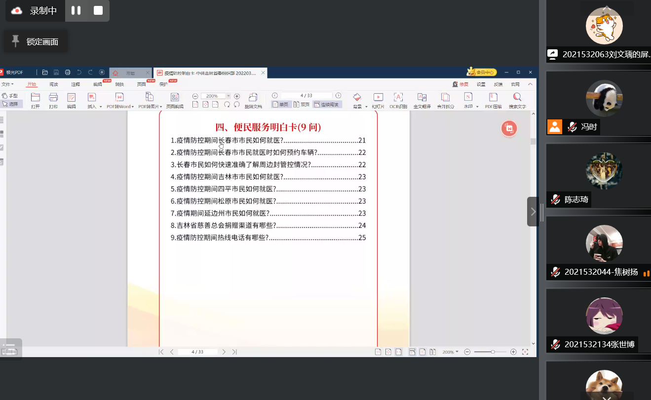 支部设置了正能量满满多媒体奖,争为人先为校牺牲奖,大锅饭最佳厨师奖,团结友爱最美吉大人奖等多个奖项。在每个奖项的提名环节中,同学们都乐于分享,疫情能够防控住,自然少不了同学们的大力支持。每日为大家进行核酸检测的大白,一直坚守在一线的老师们,我们的志愿者们,还有给吉大捐助的员工企业们。今天是封寝的第18天,同学们谨记防疫要求做到了非必要不出寝,也为抗击疫情做出自己的贡献。
