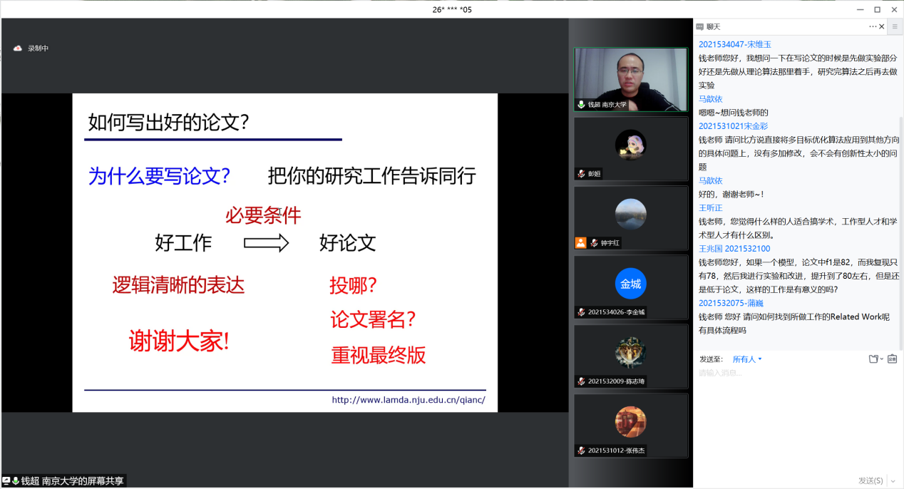 (线上特别版)暨《论文写作指导》课程第三讲顺利进行,活动采取腾讯会议和线上直播两种方式,包容更多师生参与到学术讨论中来。本期邀请了南京大学人工智能公司副教授、博士生导师钱超老师,老师以 “基于多目标演化算法的子集选择问题求解”为题,为同学们开展了一场论文写作经验分享专题讲座。