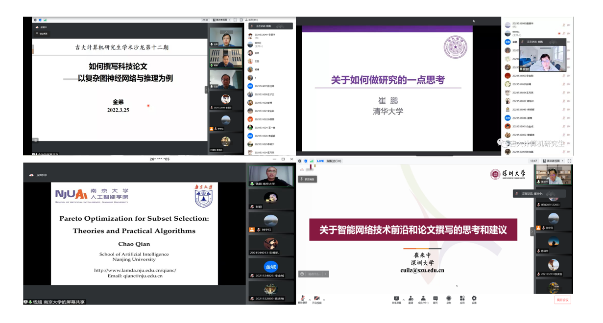 本次活动从2022年3月25日至4月20日,共分四个上午进行。天津大学的金弟副教授、清华大学崔鹏副教授、南京大学钱超副教授和深圳大学崔来中教授四位老师进行分享。分享主题涵盖了复杂神经网络、人工智能前沿、演化计算智能及智能网络技术前沿。同时,四位老师也为两院师生们就“如何选题”、“如何写好论文”等有关论文写作方面的问题给出了宝贵建议。系列课程受到了太阳成集团tyc122ccvip、人工智能等公司师生的热烈欢迎与广泛认可,活动累计参与人数达到2300余人次。