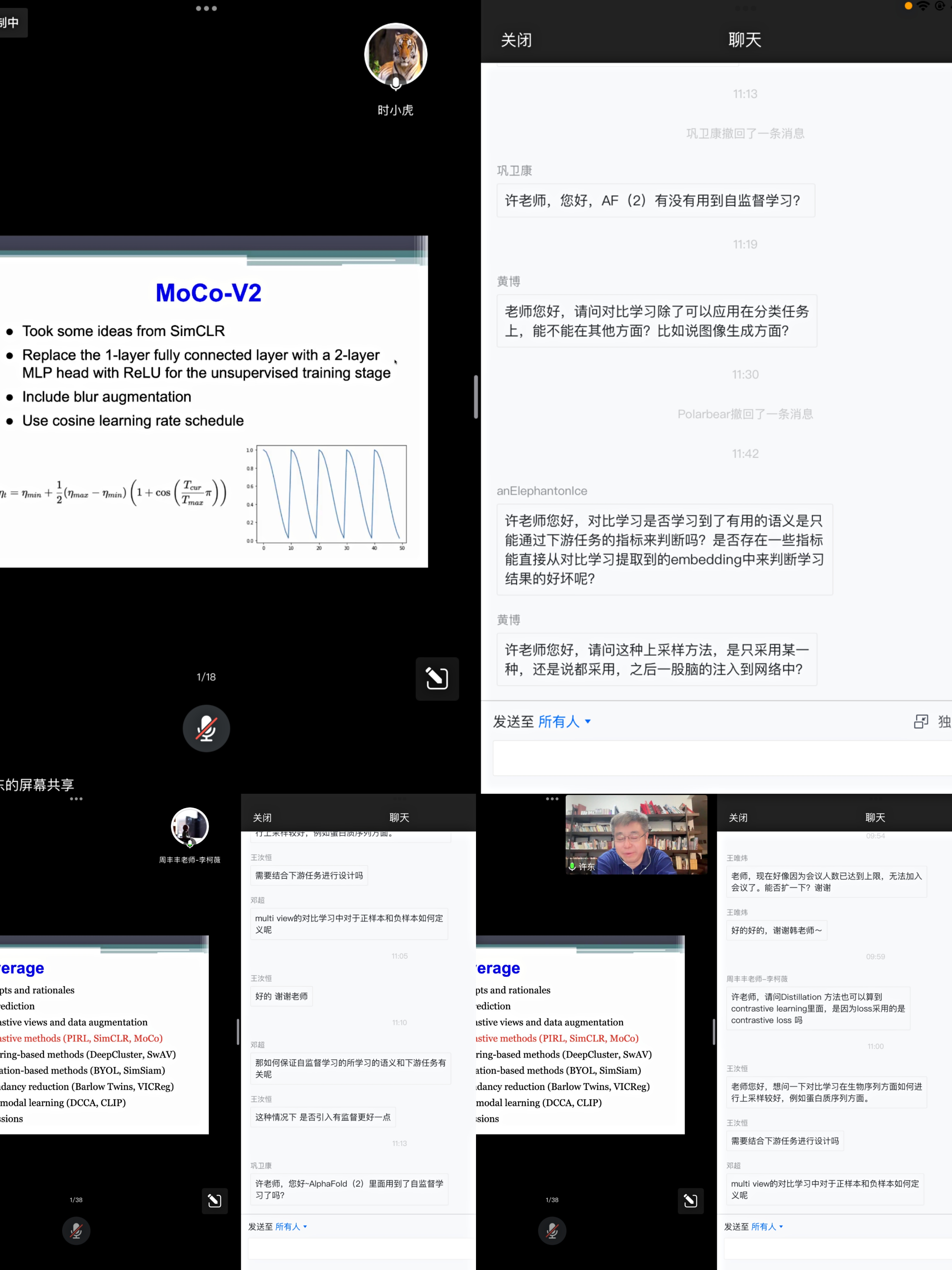 在报告的最后,许东教授给出了自监督学习与监督学习性能上直观的比较,说明了自监督学习更优的原因,从不同角度对现有的自监督学习的模型进行了分类并指出了未来自监督学习的发展方向以及目前所遇到的挑战。在讲座中及讲座后的讨论时间里,许东教授悉心回答了老师和同学们的问题。首日超过300位同学和老师参加了本次报告,并受到了公司师生的一致好评。