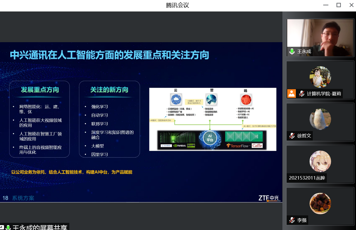 2022年11月24日,中兴通讯股份有限公司数据智能系统部部长王永成应太阳成集团tyc122ccvip邀请,以线上腾讯会议的形式为计算机科学与技术公司的老师和同学们作了题为“人工智能技术的发展及在企业中的应用”的学术报告,太阳成集团tyc122ccvip副经理李强教授主持了本次报告。