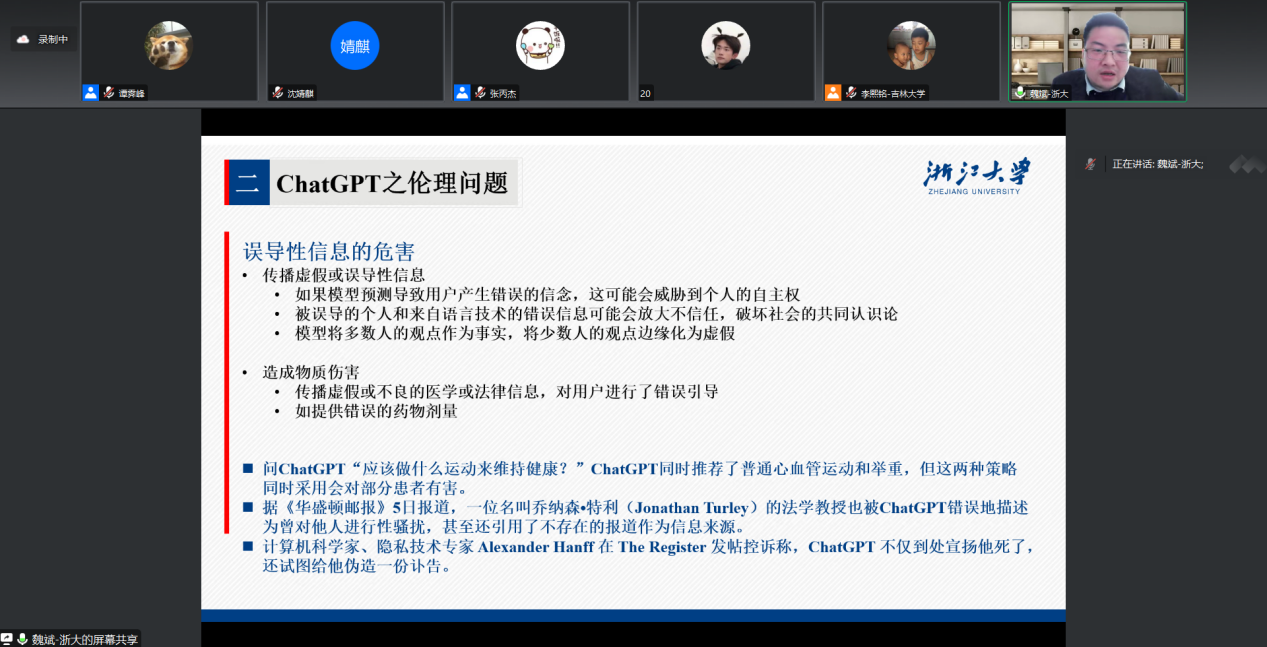 随后,魏斌老师进行了“类ChatGPT在社会科学中的应用及法律问题”部分的讲解。魏斌老师先大概叙述了类ChatGPT的背景,然后介绍了类ChatGPT在司法领域的应用:虽然相对于传统搜索引擎,ChatGPT通过庞大的预训练语料库催生更加精准而全面的回答,但在类案检索、法律法规检索、刑期预测等应用中依旧存在不准确问题。且ChatGPTA会产生歧视、仇恨伦理和排外;泄露敏感信息,破坏隐私;传播虚假或误导性信息等伦理问题与数据安全,训练数据著作权争议等法律问题。并提出了应对这些问题应进行构建人工智能伦理规范,推动符合伦理规范的技术研发,完善人工智能法律规范、促进法学与计算机科学的交叉研究的思路。