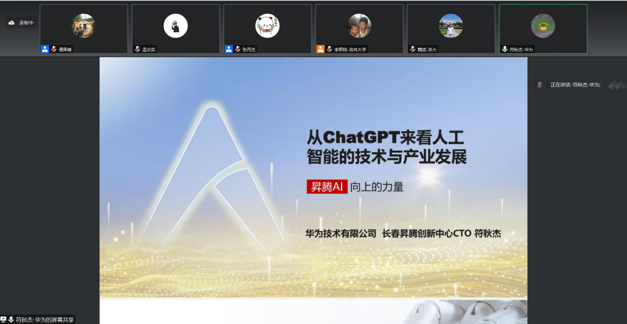 最后,符秋杰老师进行了“从ChatGPT来看人工智能的技术与产业发展”部分的讲解。符秋杰老师先以人工智能的发展趋势(大模型已成为AI产业快速发展的必然选择)为引,提出了AI集群系统面临的内存墙、性能墙、效率墙、调优墙四大挑战和大规模AI计算系统如何适应多种精度的算力要求的问题。随后介绍了昇腾通过计算架构创新及全栈系统的协同优化以满足AI发展需求,昇思MindSpore框架原生支持AI大模型训练,使能大模型应用落地等一系列华为应对上述问题采取的措施和研究成果。