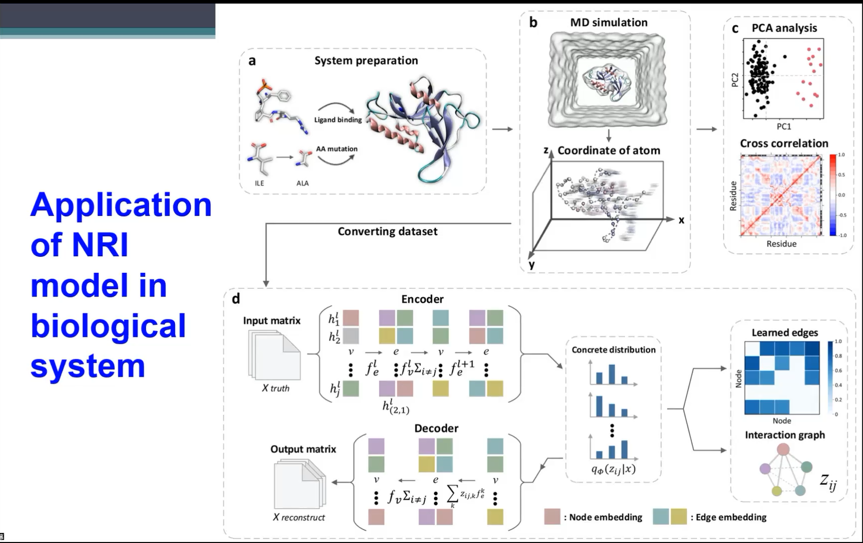 许东教授又接着分享了他对于为什么深度学习会能够帮助于分子动力学分析的观点。对于分子动力学这样一个高维的时间序列,通过embedding就能得到一些底层的模式;NRI模型在一定程度上就达到了这样的功能。