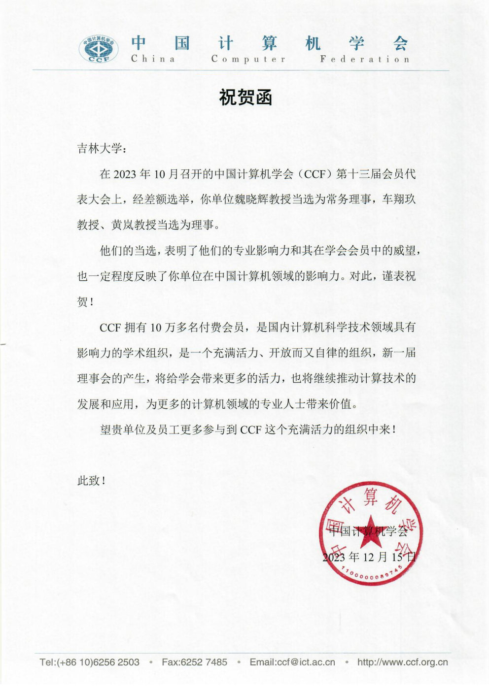 魏晓辉教授当选为中国计算机学会常务理事车翔玖教授黄岚教授当选为理事