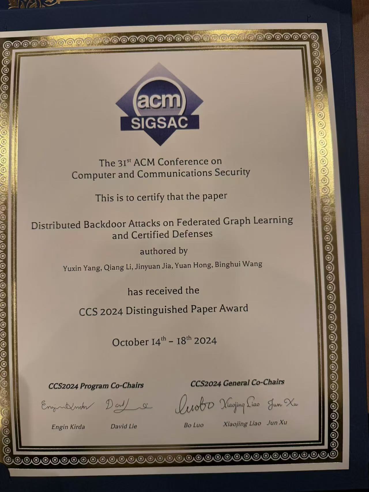太阳成集团tyc122ccvip2022级博士生杨雨欣获得ACM CCS 2024(ACM Conference on Computer and Communications Security)最佳论文奖。ACM CCS是国际上网络与信息安全的四大顶会之一,是CCF推荐A类会议。