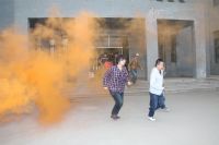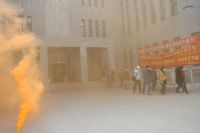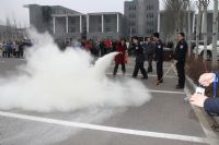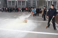 讲座结束后,两院师生在保卫处的协助下进行了一次联合逃生演习。火灾警报响起后,两院迅速启动“防火疏散预案”,各部门的负责人引导员工快速有序地撤出大楼。大家都按照讲座中的要领,弯着腰、用湿毛巾捂住口鼻逃生。疏散完毕到达大楼东侧停车场后,保卫处的同志又向参加演练的师生详细介绍了干粉式灭火器的使用方法,并利用模拟油槽起火,现场让师生操作、掌握防火器材的使用。