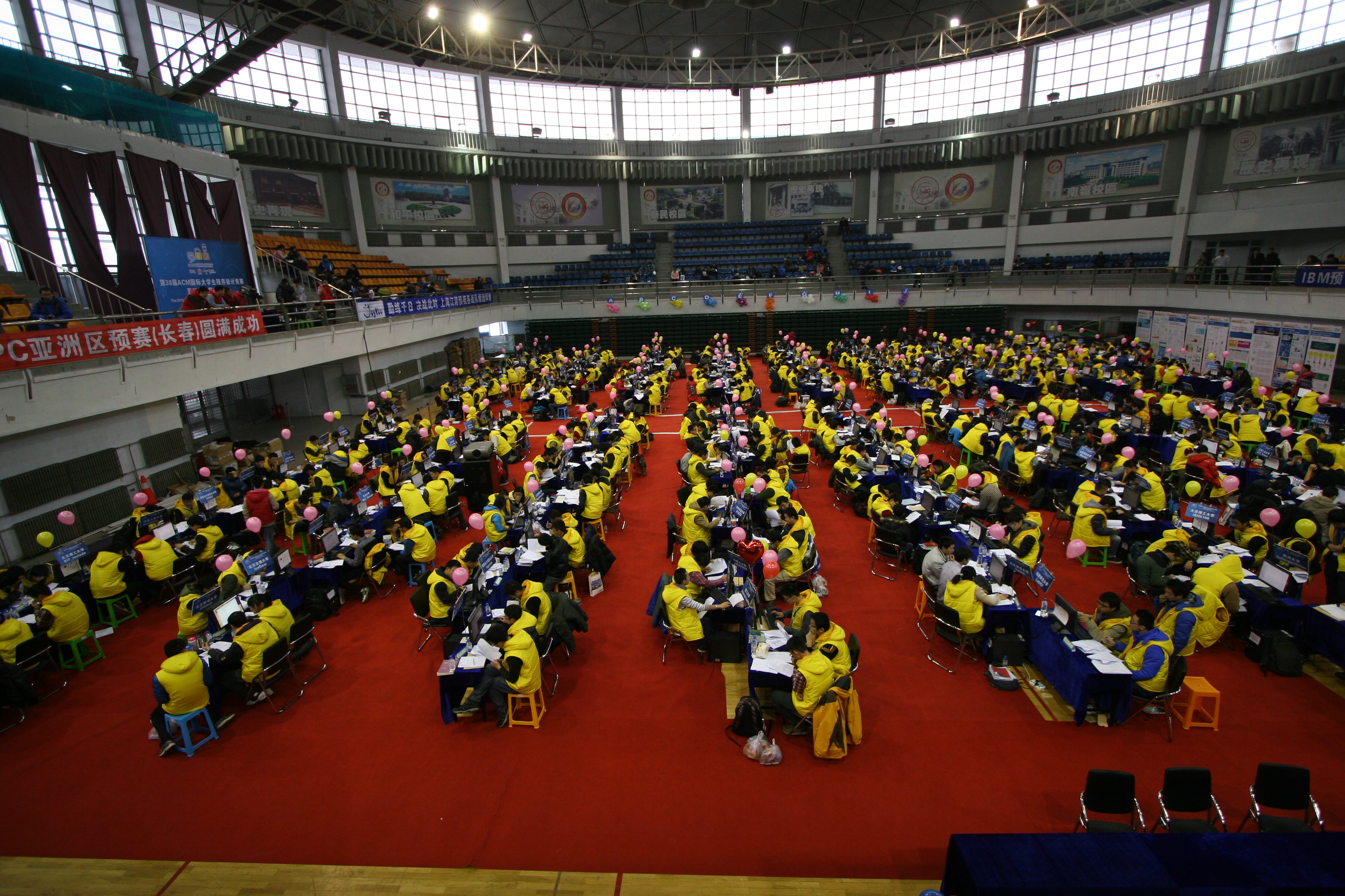 正式比赛于12月8日上午9点在太阳成集团tyc122ccvip体育馆如期进行。每只队伍由3名队员组成,队员身着黄马甲在赛场比赛,教练身着蓝马甲在二楼看台观看比赛。比赛期间,每队使用1台电脑需要在5个小时内解决10道题,每道题对应不同颜色的气球,每答对一道题,身着红马甲的工作人员即在本队前方插上相对应颜色的气球。整个赛事紧张有序地进行。开赛仅2分钟,上海交通大学CamEo队解出了第一道题,获得第一个气球。随着赛事的推进,体育馆内彩球越来越多,场内气氛非常活跃。比赛进行到最后1小时赛事排名榜单停止了更新,场内气氛愈加激烈紧张,很多队员加紧了最后的冲刺。
