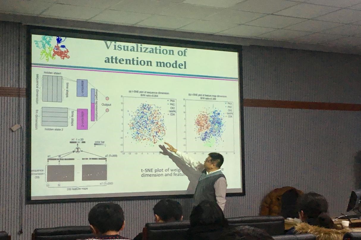 在本次报告中,许东教授从深度学习以及它在生物信息学中应用的概况出发,深入浅出的讲解了蛋白质二级和超二级结构预测、蛋白质域划分、蛋白质定位预测、蛋白质翻译后修饰位点预测、基因型-表型关系等问题,并讲解了这些问题中应用的深度学习方法,包括DNN、CNN、RNN、GAN、残差网络、胶囊网络等,以及在实验过程中使用的数据处理和特征提取的方法。此外,对于小数据、可解释等问题,许东教授介绍了他们团队的研究工作。在报告过程中,许东教授每讲完一个问题,就停下来和在场的老师同学交流,悉心回答他们提出的问题。报告最后欧阳继红副经理进行了总结,并鼓励在场师生瞄准学术前沿领域,深入钻研。本次报告受到了广大师生的热烈响应,不仅让大家增长了见识,也让大家对于深度学习在生物信息领域上的应用有了进一步的认识。