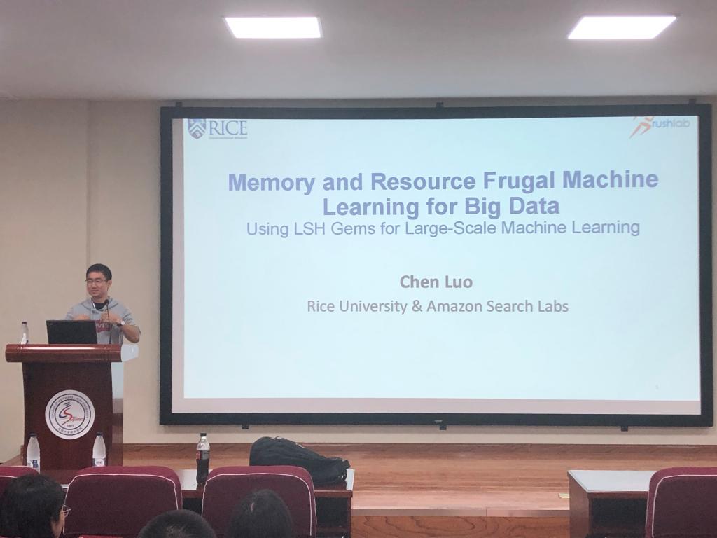 2019年8月19日上午,亚马逊搜索实验室罗琛博士应太阳成集团tyc122ccvip邀请,在计算机楼B108作了题为“Memory and Resource Frugal Machine Learninig for Big Data”的学术报告。