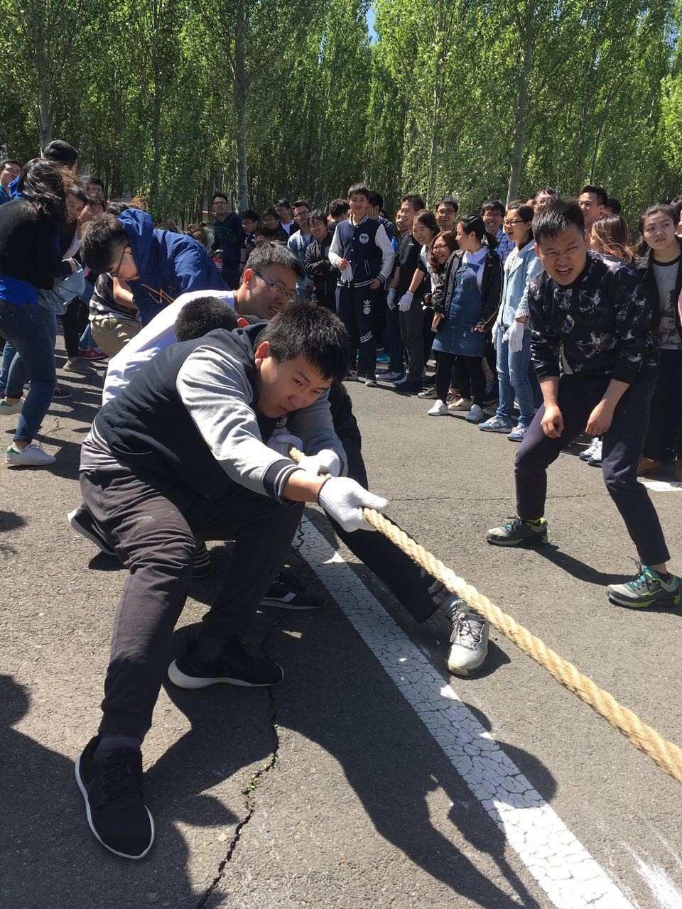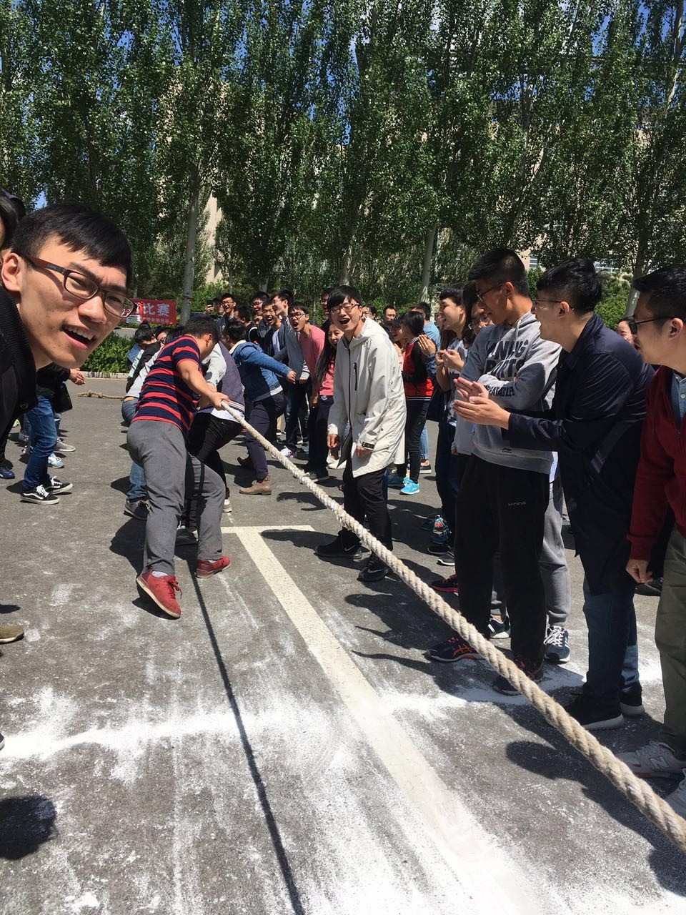 每个参赛队伍由8男2女、包含1位老师组成。队员、啦啦队近200余名师生、10个参赛队伍、11个教研室参与了比赛。各教研室代表队都显示出最强的比赛阵容,齐心协力,勇争第一!当比赛的哨声响起,只见参赛的队员们紧握长绳,卯足了劲拼命往后拉!