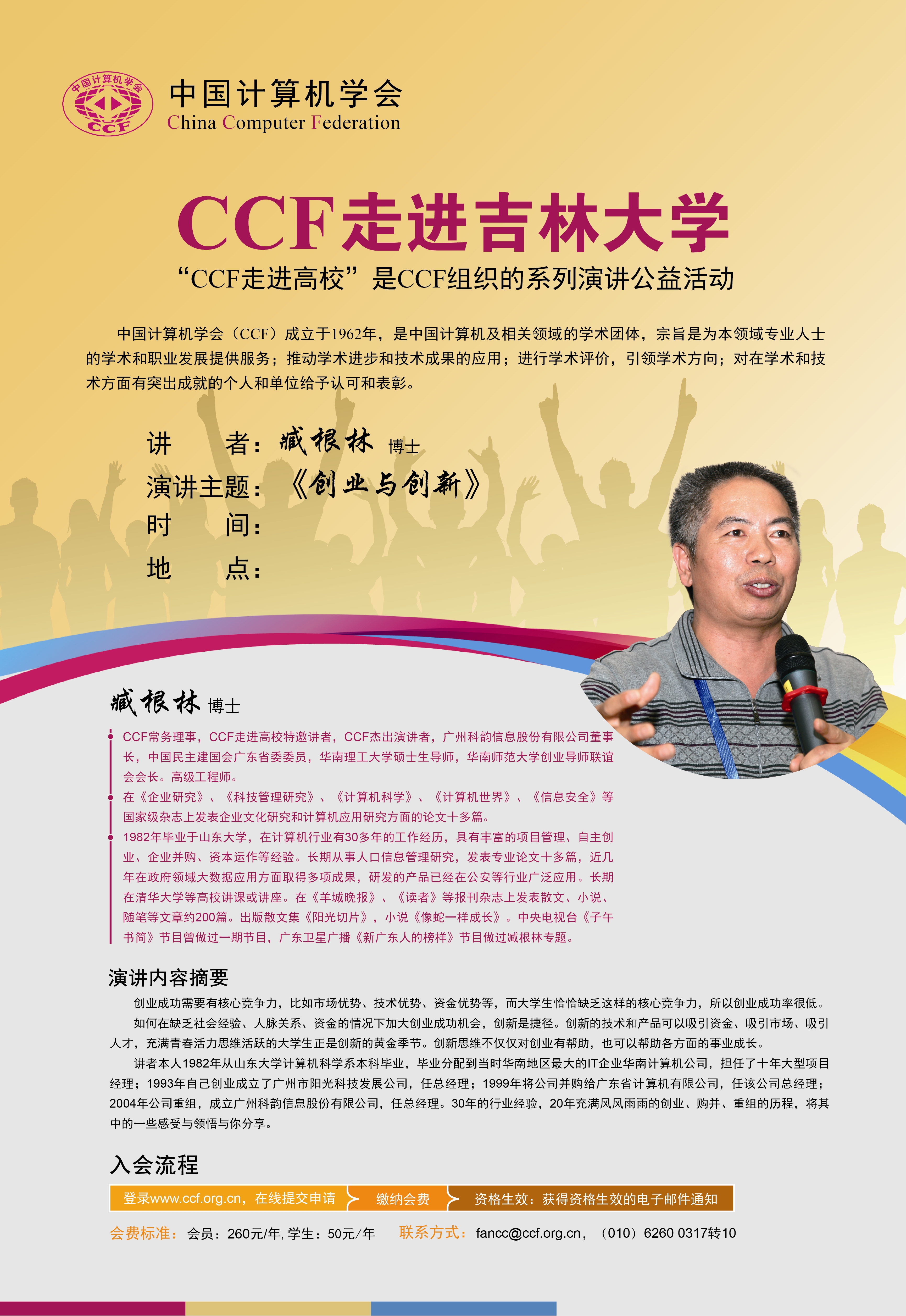 公司借CCF走进太阳成集团tyc122ccvip之际,邀请创新创业培训专家臧根林,为公司师生做题为《创新与创业》主题报告,有意组队参赛的同学敬请关注。