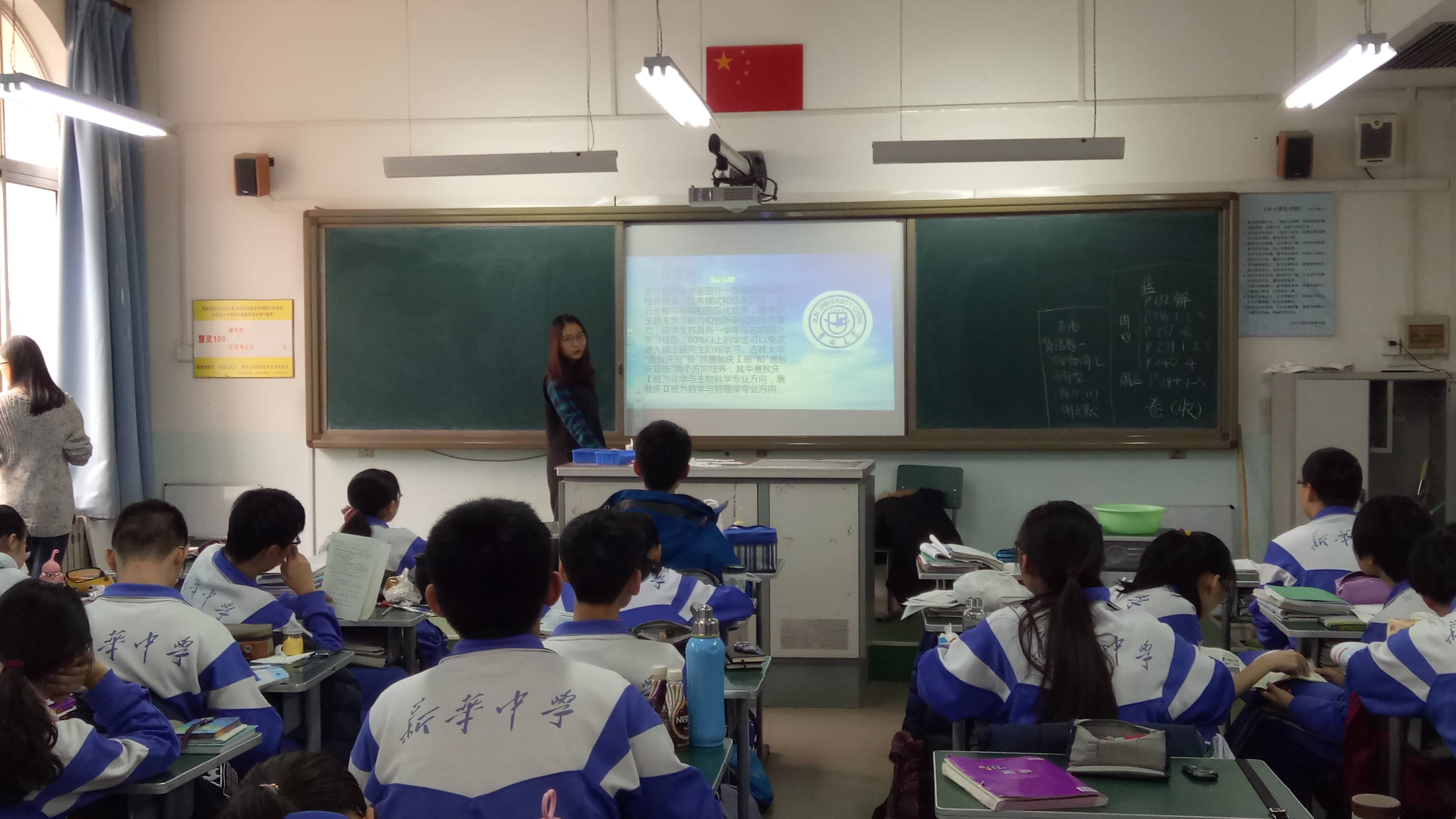 为了此次演讲的顺利进行,他们联系了母校的主任,确定了以走班级为形式来开展宣讲活动。除此之外,他们还制作了精致的PPT,精心准备了宣讲使用的背景音乐。伴随着柔缓的音乐,他们开始了宣讲。首先通过视频,他们向学弟学妹们展示了吉大的风光:北国雪景,映衬着蓝天的是素裹的楼宇和树林,还有那明净结冰的湖面反射着金灿灿的阳光;到了夏天,有成荫的绿树和耀眼的喷泉,一切都是那么美好……紧接着,他们通过PPT向同学们展示吉大的校园资源:包括两座精致且藏书丰富的图书馆、国家级实验教学中心、时有赛事举行的体育馆、以及丰富的讲座资源。接着,他们还介绍了吉大的办学理念、教育实力以及人才培养方案。学弟学妹们都听得很认真,时有提问,他们也都一一认真回答。最后在学弟学妹们的掌声中,此次宣讲圆满结束。