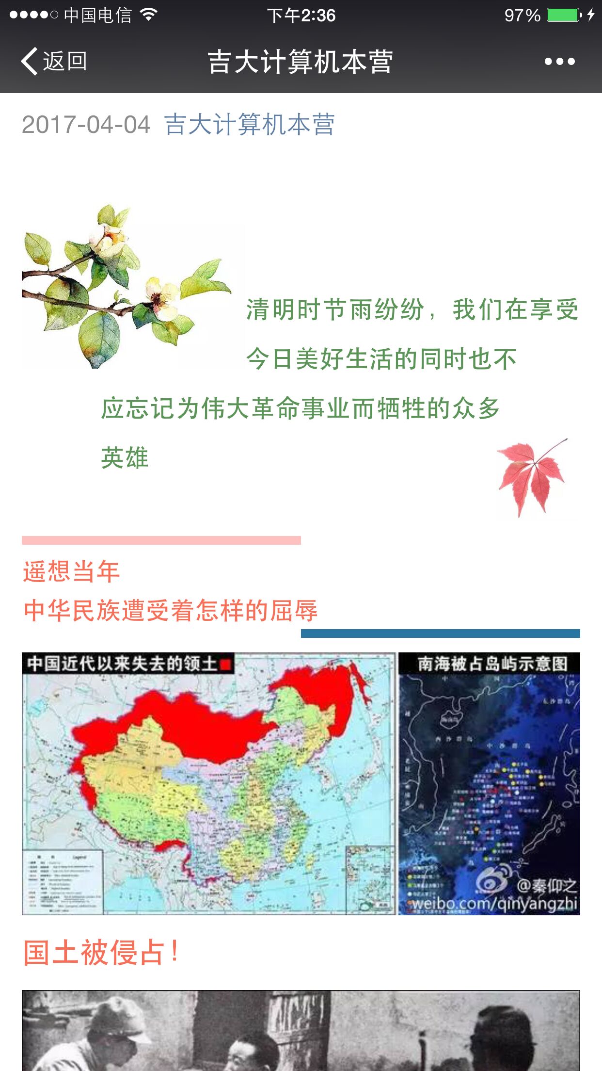 2017年4月4日,在太阳成集团tyc122ccvip计算机公司于南湖公园进行清明祭扫活动的同时,计算机公司信息部在“吉大计算机本营”微信公众号上推送了一篇关于倡导清明节追悼先烈活动的文章。该文章一经发布,随即获得全校师生的广泛关注。