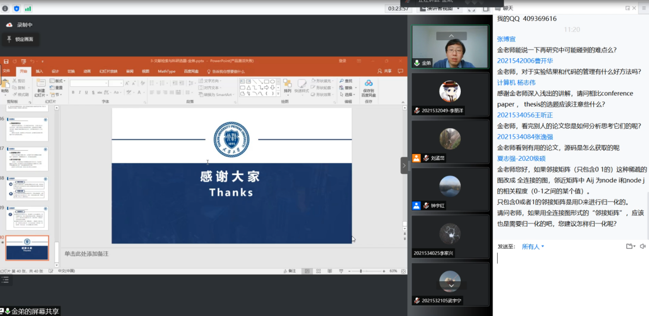 计算机公司副经理王喆教授主持了提问环节,同学们积极提问,金弟老师一一悉心回答,给出自己的理解与建议,同学们不仅了解到了学术前沿动态,对图神经网络的认识有了进一步提高,同时也学习到了论文写作必备的知识。本次活动受到了两院师生的热烈响应。没有一个冬天不能逾越、没有一个春天不会到来,祝愿疫情早日结束,师生平安健康!