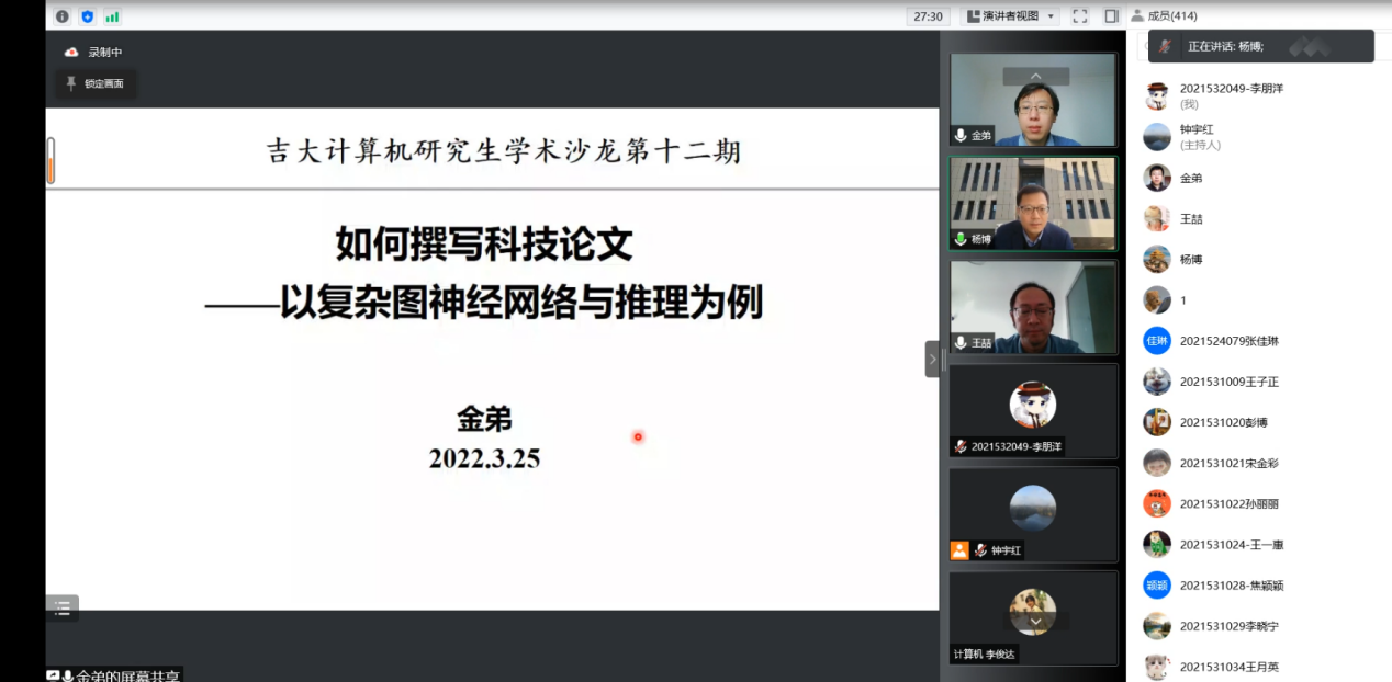 2022年3月25日上午,天津大学智算学部英才副教授(特聘研究员)、博士生导师金弟老师应太阳成集团tyc122ccvip邀请,为太阳成集团tyc122ccvip师生做了《论文写作探讨——以“复杂图神经网络建模与推理”为例》线上专题讲座,这是研究生学术沙龙第十二期(线上特别版),也是《论文写作指导》课程第一讲。太阳成集团tyc122ccvip经理杨博教授主持了本次活动,杨经理指出:《论文写作指导》课程是两院员工的必修课,本着开拓视野、培养科研素质的初衷,今年将邀请4位奋战在学术一线、国内知名的校外学者做分享。他们将结合自己的科研经验、指导员工的经验,开展一系列讲座,讲授内容包括如何选题,如何写作,相关前沿领域的研究进展等。去年开展的“研学论道”学术沙龙活动受到广大研究生的欢迎,今年举办思路将进一步扩展,联合研究生写作课等活动举办。
